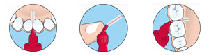 Die Auswahl der richtigen Größe ist sehr wichtig. Oft sind es 2 oder 3 Größen. Die Borsten sollen den Zwischenraum ausfüllen, jedoch soll der Drahtkern nicht den Zahn berühren. Nie mit Gewalt die Bürsten in die Zwischenräume zwängen! Fragen Sie nach Ihrer richtigen Größe.